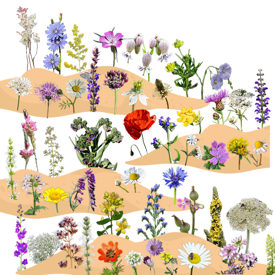 A következő fajokat tartalmazza:*baltacim (Onobrychis viciifolia), buglyos fátyolvirág (Gypsophila paniculata), búzavirág (Centaurea cyanus), dúsvirágú ökörfarkkóró (Verbascum densiflorum), egynyári tisztesfű (Stachys annua), ékes vasvirág (Xeranthemum annuum), erdei mályva (Malva sylvestris), évelő len (Linum perenne), ezüstös pimpó (Potentilla argentea), fehér hamuka (Berteroa incana), fehér mécsvirág (Melandrium album), festő pipitér (Anthemis tinctoria), hólyagos habszegfű (Silene vulgaris), homoki habszegfű (Silene conica), kamilla (Matricaria chamomilla), kaporlevelű ebszékfű (Matricaria inodora), keleti szarkaláb (Delphinium orientalis), kígyóhagyma (Allium scorodoprasum), koloncos legyezőfű (Filipendula vulgaris), konkoly (Agrostemma githago), közönséges cickafark (Achillea millefolium), közönséges ebnyelvűfű (Cynoglossum officinale), közönséges galaj (Galium mollugo), közönséges orbáncfű (Hypericum perforatum), lándzsás útifű (Plantago lanceolata), ligeti zsálya (Salvia nemorosa), magyar zsálya (Salvia aethiopis), mezei katáng (Cichorium intybus), mezei katicavirág (Nigella arvensis), mezei zsálya (Salvia pratensis), nyári hérics (Adonis aestivalis), nyúlszapuka (Anthyllis vulneraria), orlay turbolya (Orlaya grandiflora), orvosi atracél (Anchusa officinalis), orvosi szappanfű (Saponaria officinalis), osztrák zsálya (Salvia austriaca), parlargi pipitér (Anthemis arvensis), pipacs (Papaver rhoeas), réti imola (Centaurea jacea), réti margitvirág (Leucanthemum vulgare), szarvaskerep (Lotus corniculatus), szöszös bükköny (Vicia villosa), szurokfű (Origanum vulgare), tarka koronafürt (Securigera varia), tejoltó galaj (Galium verum), terjőke kígyószisz (Echium vulgare), vadmurok (Daucus carota), vadrezeda (Reseda lutea), vastövű imola (Centaurea scabiosa), vetési boglárka (Ranunculus arvensis)