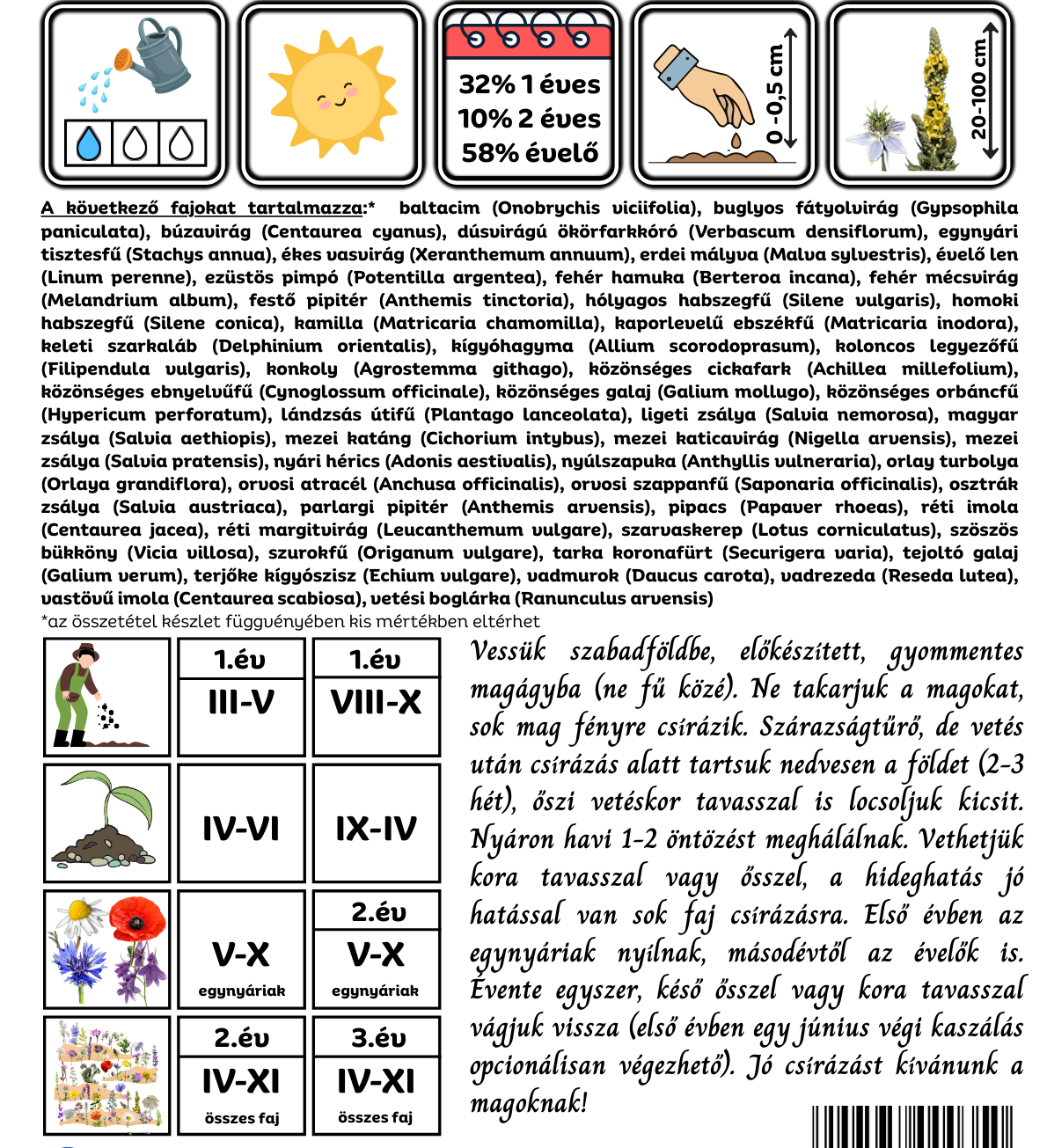 A kifejlett növények általában már szárazságtűrőek, de hatalmas aszály esetén havi 1-2 öntözést meghálálnak. Első évben az egynyári fajok virágzanak, másodévtől pedig a kétnyáriak és évelők is csatlakoznak a virágzáshoz, de első évben ők csak zöldet növesztenek. A terület második évtől áll össze igazán és lesz egyre látványosabb, de cserébe az évelők onnantól kezdve minden évben virágzanak és egyre bokrosodnak és nem kell őket újravetni sem. Legyünk türelemmel, megéri! 🙂 Első évben, a talajelőkészítés során a felszínre kerülhetnek a földben fekvő egynyári gyommagvak is. Ezeket első évben célszerű eltávolítani, de második évtől már összeáll a vegetáció és kiszorulnak. Őszi vetéskor ez kevésbé fordul elő. A területet elég évente egyszer, késő ősszel vagy kora tavasszal kaszálni/nyírni. Jó csírázást kívánunk a magocskáknak!