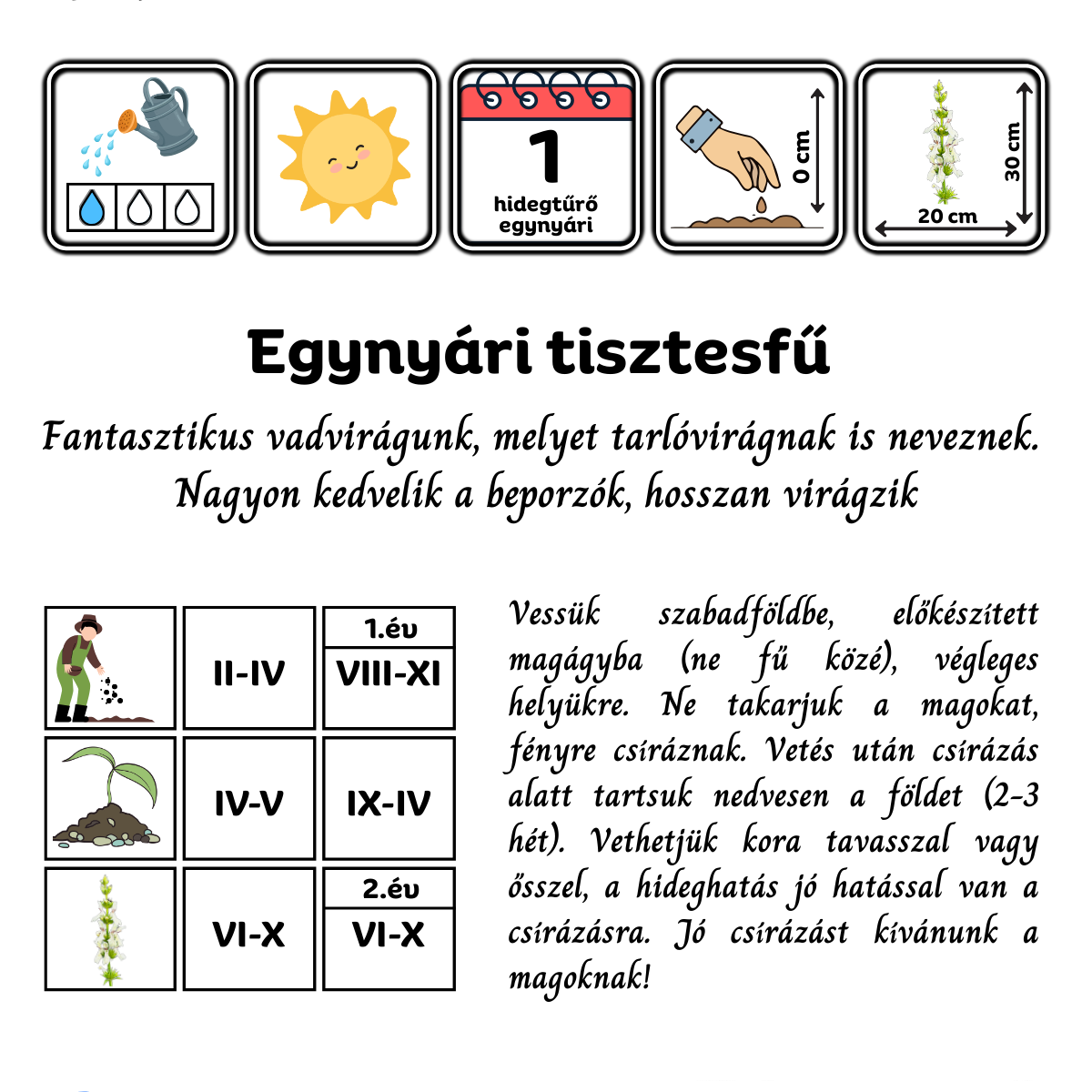 Vessük szabadföldbe, előkészített magágyba (ne fű közé), végleges helyükre. Ne takarjuk a magokat, fényre csíráznak. Vetés után csírázás alatt tartsuk nedvesen a földet (2-3 hét). Vethetjük kora tavasszal vagy ősszel, a hideghatás jó hatással van a csírázásra. Jó csírázást kívánunk a magoknak!