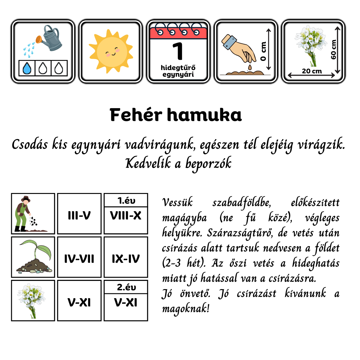 A fehér hamuka (Berteroa incana) őshonos magyar vadvirág, mely számomra szerelem volt első látásra. A ráckevei gáton találkoztunk először, egy nagyon késői őszi napon, amikor a legtöbb vadvirág már rég magot érlelt. Bezzeg a fehér hamuka! Ő csak ontotta és ontotta fehér virágait, pedig hol volt már a nyár. Ez a fehér hamuka egyik legnagyobb értéke is: még akkor is hasznos az élővilág és a beporzóink számára, amikor a többi vadvirág már téli álmot alszik. Angol neve „hoary alyssum”, tehát a mézvirághoz hasonlónak találták, a „hoary” szó pedig ezüstös-molyhos leveleire utal. Lovakra mérgező – ez legeltetésnél nem szokott gondot okozni, mert tudják és nem eszik meg, de szénába keveredve nem tudják kiválogatni és veszélyes lehet rájuk. A káposztafélékhez tartozik.