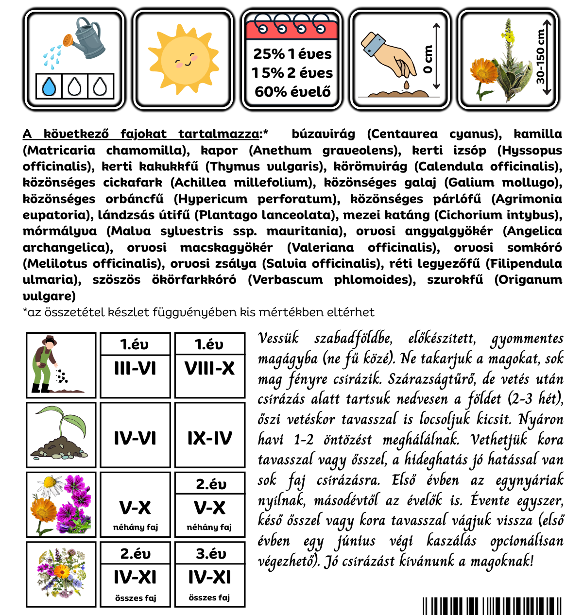 A Hörbi 3.0 az új gyógynövényekből álló magkeverékünk, mely 20 magyar és európai fajt tartalmaz. Egynyári, kétnyári és évelő fajok is vannak a mixben, melyek egy részének a virágzatát (kamilla, búzavirág, mórmályva), némelynek a leveleit (közönséges kakukkfű, orvosi zsálya, szurokfű), némelynek pedig a gyökerét (orvosi angyalgyökér, orvosi macskagyökér) lehet felhasználni. Némelynek pedig bármely részét, pl. a katáng gyökeréből készül a cikóriakávé, de a virágzata és levelei is ehetőek.  A gyógynövények és felhasználásuk alapos ismerete nélkül inkább csak gyönyörködj bennük!