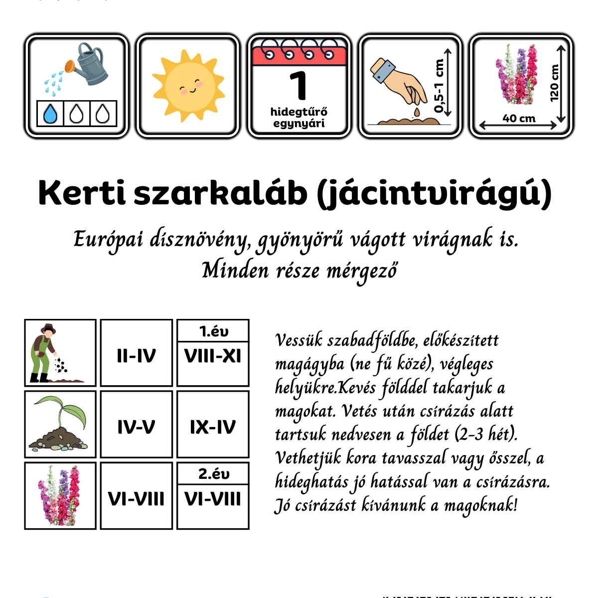 A kerti szarkaláb (Consolida ajacis) őshonos európai vadvirág, melynek nemesített formája ez a jácintvirágú változat. Egyike az egyik legegyszerűbben nevelhető növényeknek, mind az őszi, mind a tavaszi vetés eredményes, könnyen növő egynyári fajta. Ha sosem volt szerencséd a magvetéssel, akkor érdemes ezzel a fajtával elkezdeni, szinte garantált a siker. Ennek a változatnak gyönyörű, jácintvirágú virágai vannak, nagyon különleges nemesítés. Nagyon sokáig nyílik, szinte egész nyáron, őszi vetés esetén korábban, akár már májusban megkezdi a virágzást. Jó önvető, ehhez hagyjuk a virágok magra menni, ne vágjuk le idő előtt. Tökéletes vágott virágnak is, csokrokba, bokrétákba. A kerti szarkaláb a többi szarkalábhoz hasonlóan mérgező.