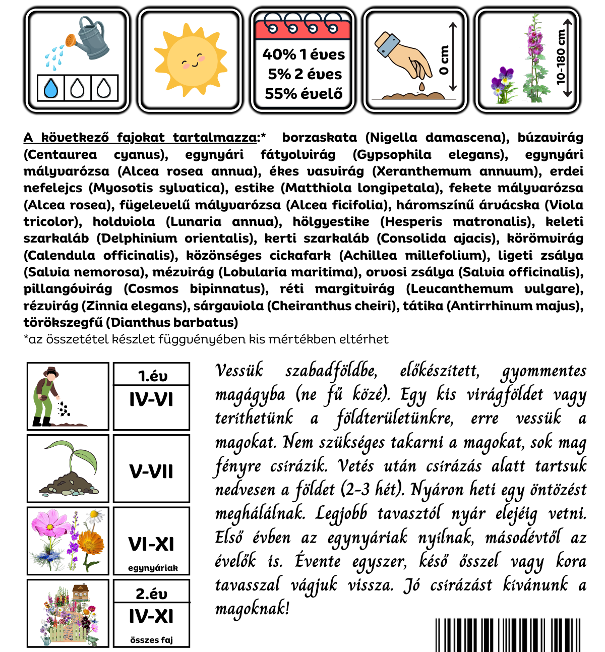 A vetésnél nagyon fontos, hogy megfelelően előkészített, gyomoktól megtisztított, porhanyósra gereblyézett föld tetejére vessük a magokat. Javasolt pár cm vastagságban komposztot vagy virágföldet terítenünk a tetejére, hogy a csírázást jobban ösztönözzük. Egyet gereblyézhetünk a területen a magok szórása után, vagy szórjuk rá kb fél-1 cm földet. Csírázási idő alatt tartsuk nedvesen a területet. Egynyári, kétnyári és évelő fajokat is tartalmaz. Első évben az egynyáriak virágzásában gyönyörködhetünk, addig a kétnyári és évelő fajok csak zöldet növesztenek. Második évtől a kétnyáriak és az évelők kezdenek virágozni, legyünk velük türelemmel 🙂