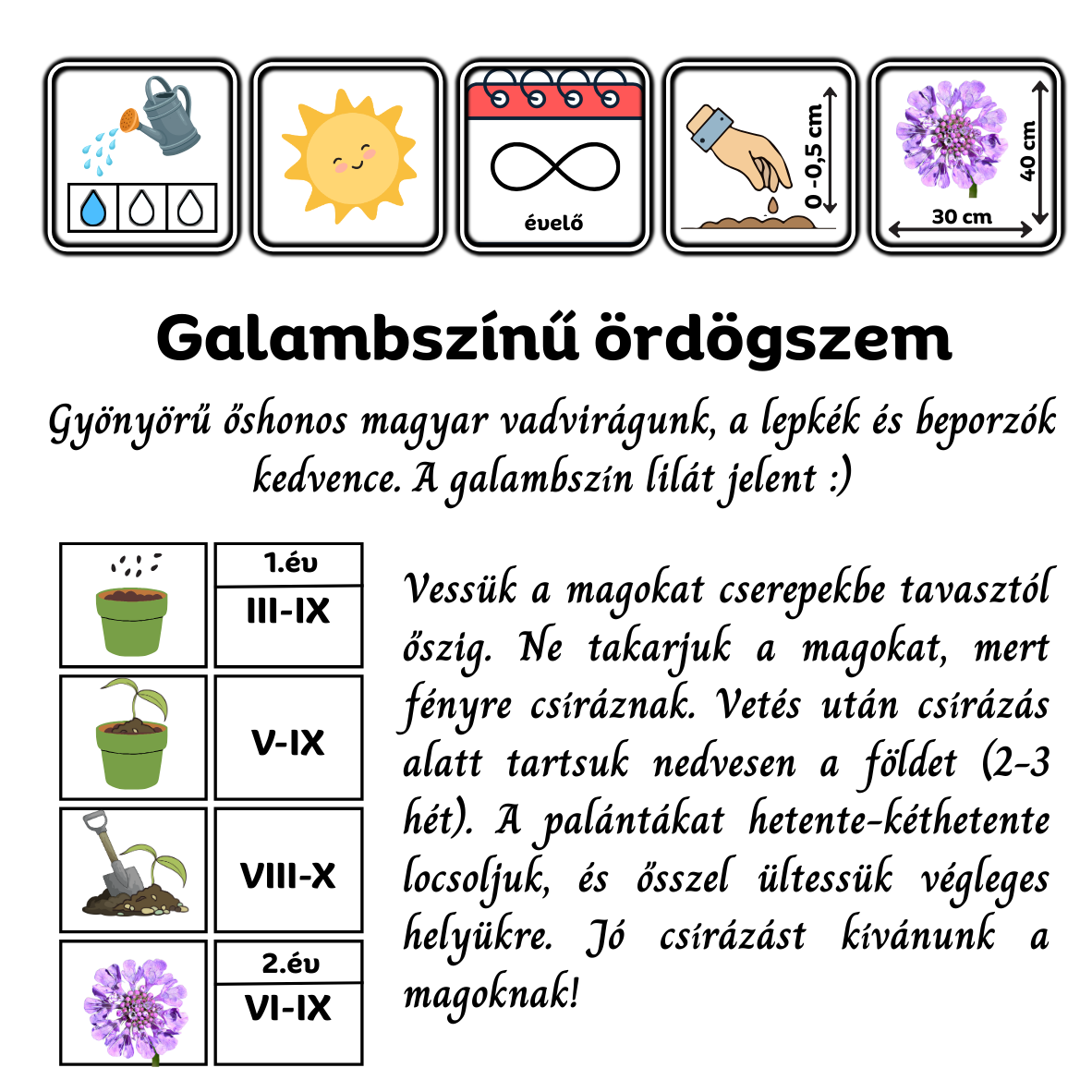 Az első néhány hétben tartsuk nedvesen a földet. A palántákat hetente-kéthetente locsoljuk, nyár végén/tavasszal ültessük végleges helyükre. A hideghatás jó hatással van a csírázásra. Általában vetés utáni évtől virágzik. Gyönyörködj a látványban!