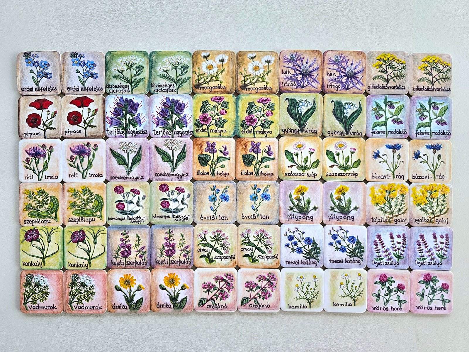 Ebben a szettben 30 pár memóriakártyát találtok, amikkel a gyerekek vagy a felnőttek játékosan meg tudják ismerni a vadvirágainkat. Az illusztrációk igazán valósághűek és csodásak lettek, igazi csemege és tökéletes ajándék a vadvirágok és a természet szerelmeseinek.